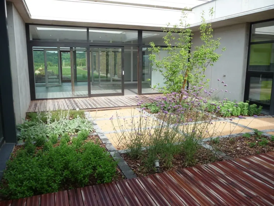 Ce bâtiment d’une très grande qualité est implanté sur un replat naturel dans un paysage pourtant vallonné. Le projet s’organise autour de nombreux patios afin que chaque patient, résident et employé bénéficient de vues extérieurs, sur les jardins, le ciel ou le paysage.