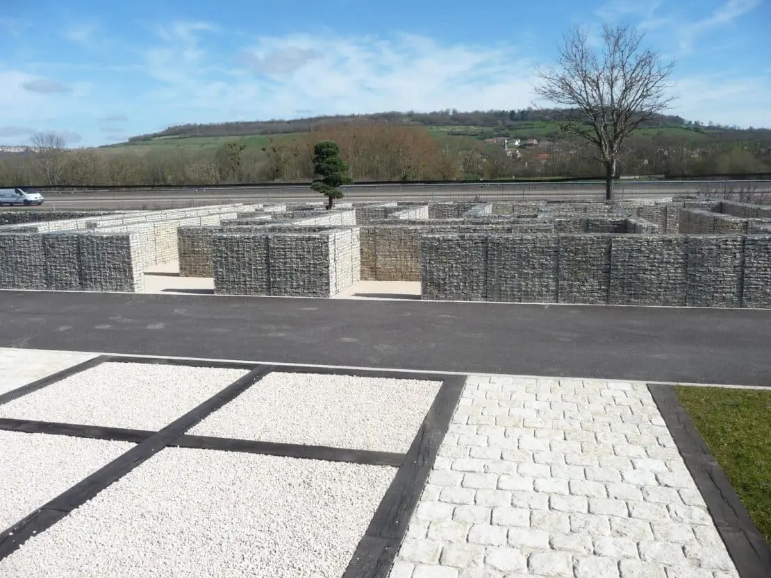 Mise en valeur et scénographie des matériaux de l’entreprise (gabions en pierre de lave, murets, pavage, pas japonais, calade, four à pain, emmarchements)